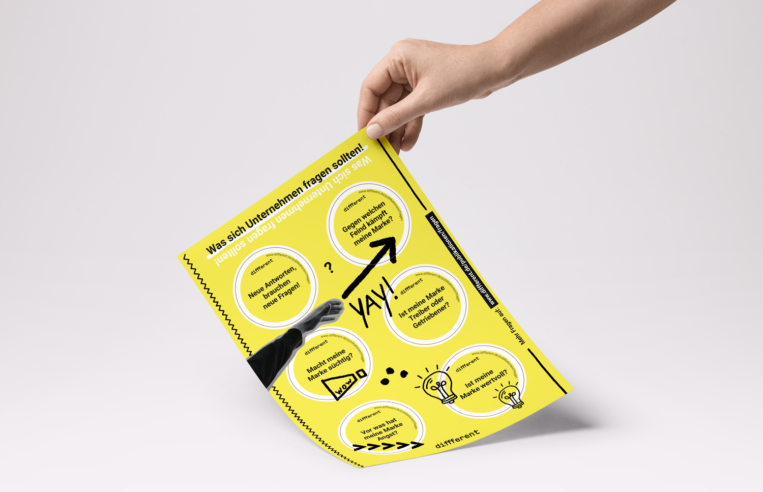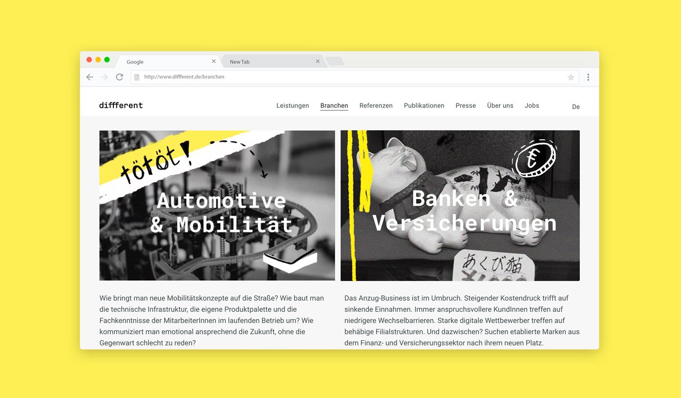 diffferent is a strategy consultancy based in Berlin. The fusion with a sister agency asked for a fresh layer of paint over their (digital) facade. As their name suggests, diffferent is not like “the other classic consultancies”. The work below should reflect that.